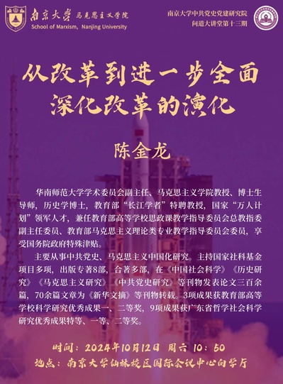 陈金龙,华南师范大学学术委员会副主任、马克思主义学院教授、博士生导师,历史学博士,教育部“长江学者”特聘教授,兼任教育部高等学校思政课教学指导委员会总教指委副主任委员、教育部马克思主义理论类专业教学指导委员会委员,享受国务院政府特殊津贴。主要从事中共党史、马克思主义中国化研究。主持国家社科基金项目多项,出版专著8部,合著多部,在《中国社会科学》《历史研究》《马克思主义研究》《中共党史研究》等刊物发表论文三百余篇,70余篇文章为《新华文摘》等刊物转载。3项成果获教育部高等学校科学研究优秀成果一、二等奖,9项成果获广东省哲学社会科学研究优秀成果特等、一等、二等奖。